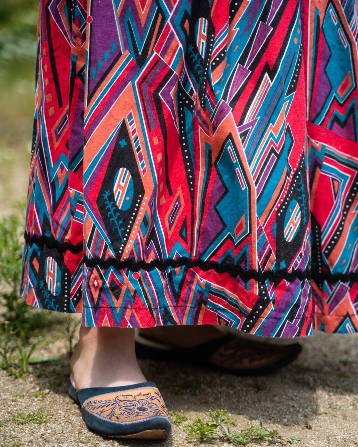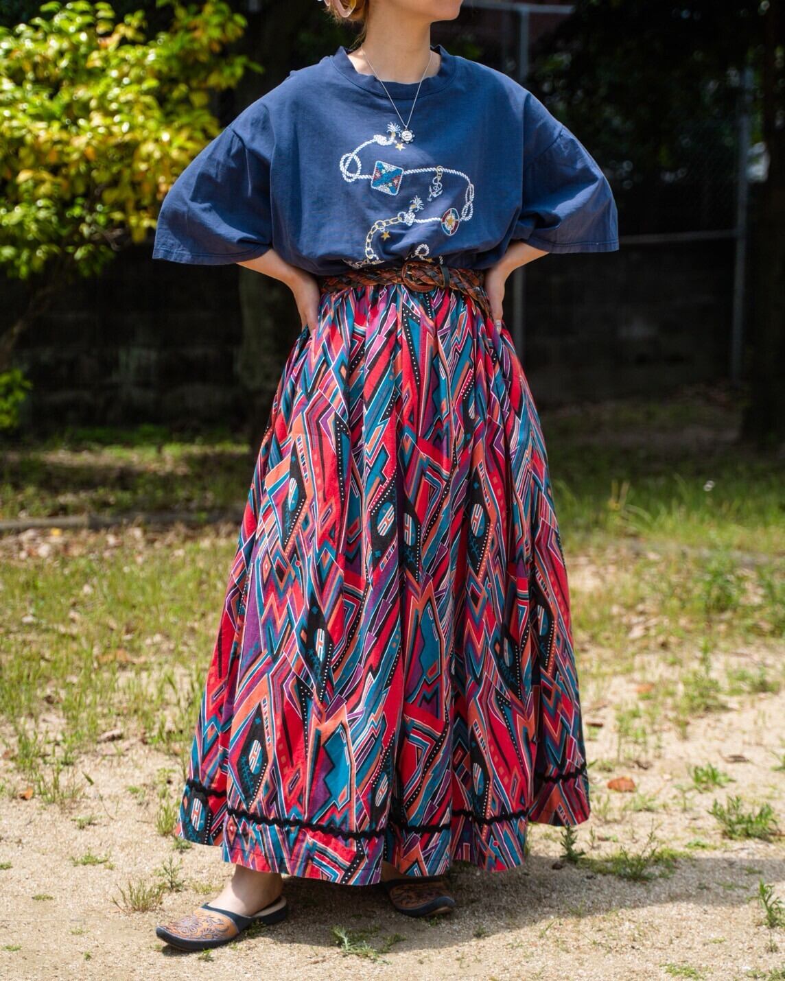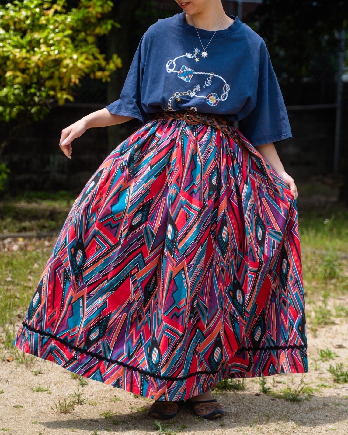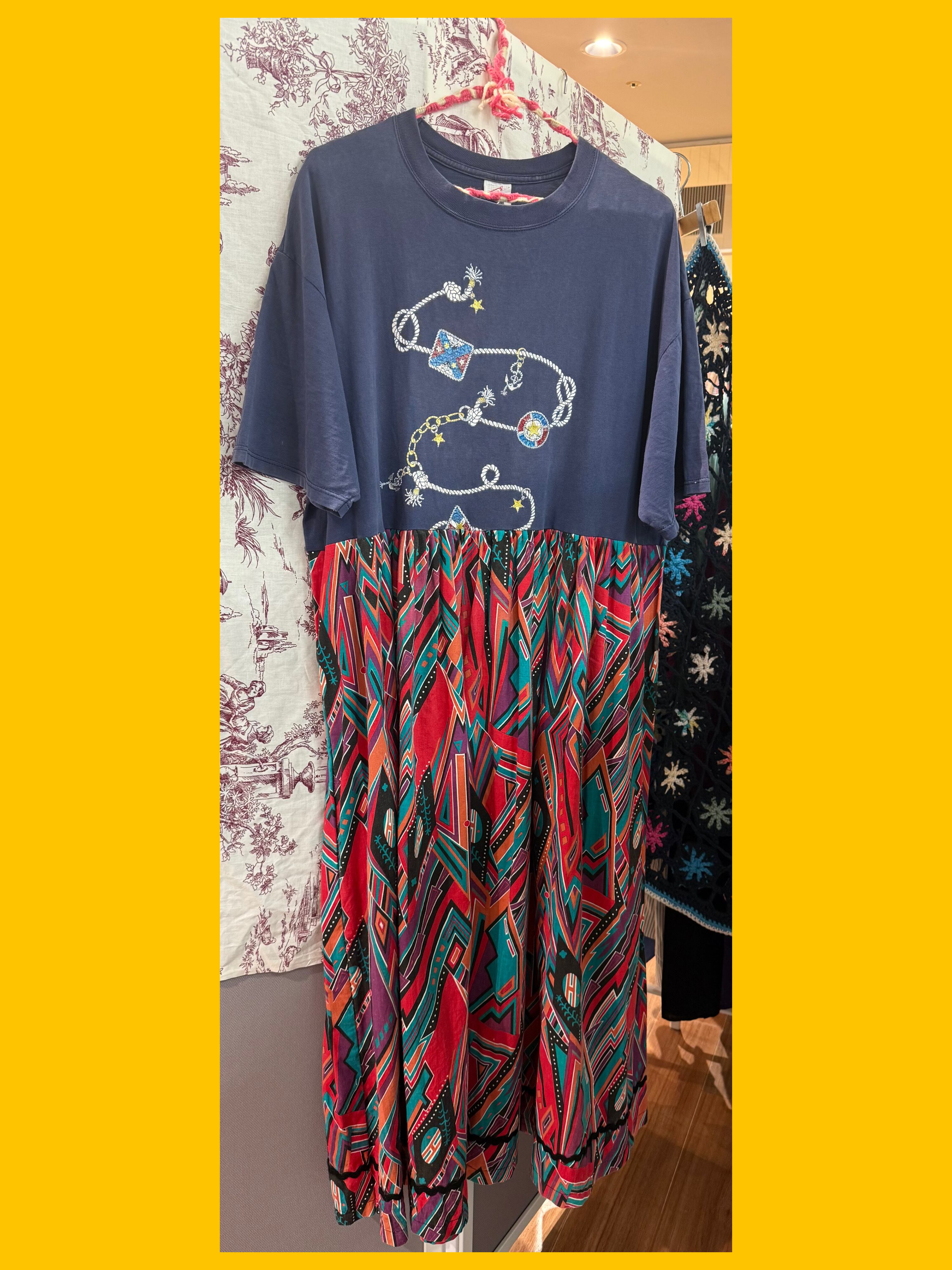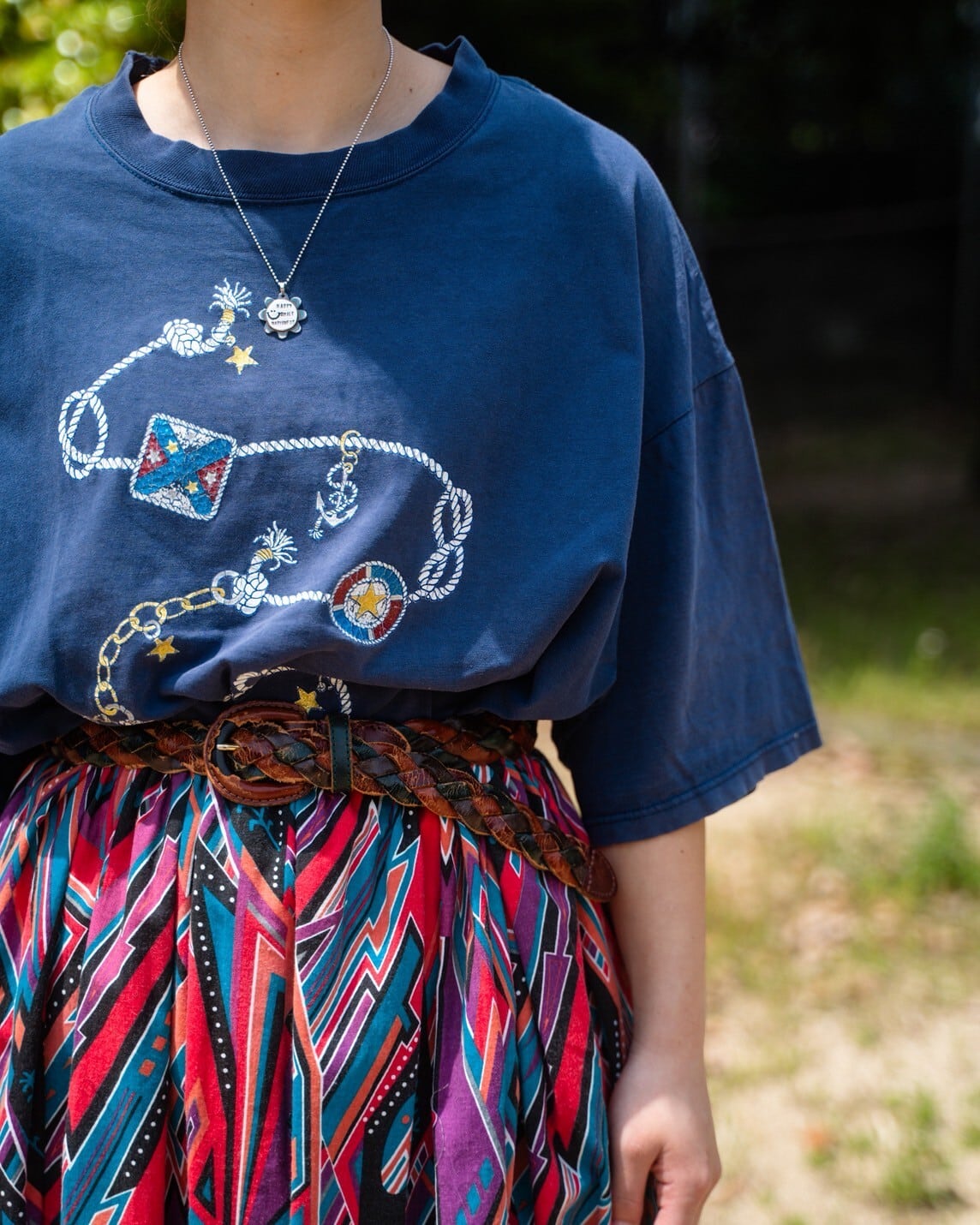 アメリカ古着のTシャツをベースに、アメリカ仕入れのファブリックを繋ぎ合わせたアイテム。