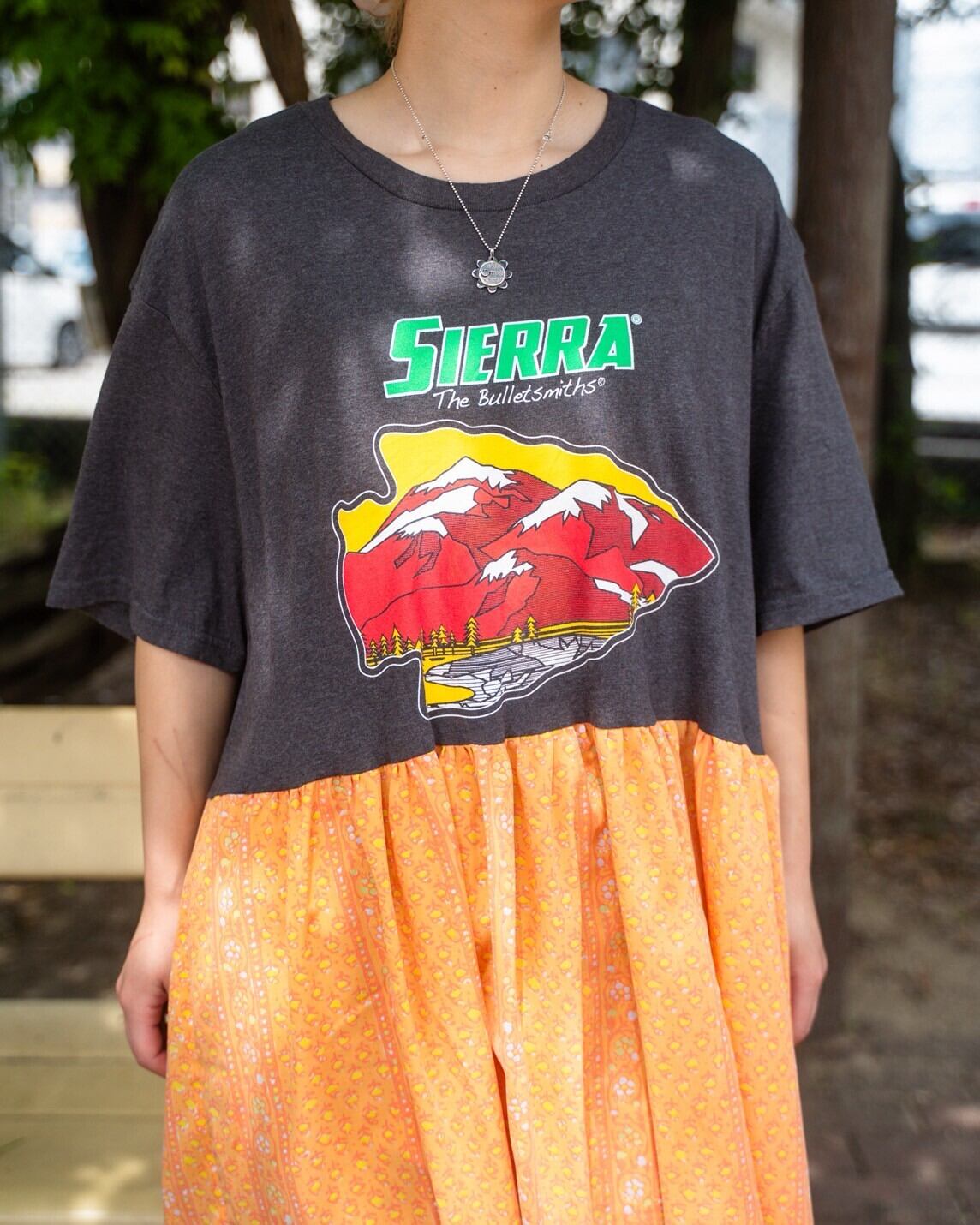 アメリカ古着のTシャツをベースに、アメリカ仕入れのファブリックを繋ぎ合わせたアイテム。