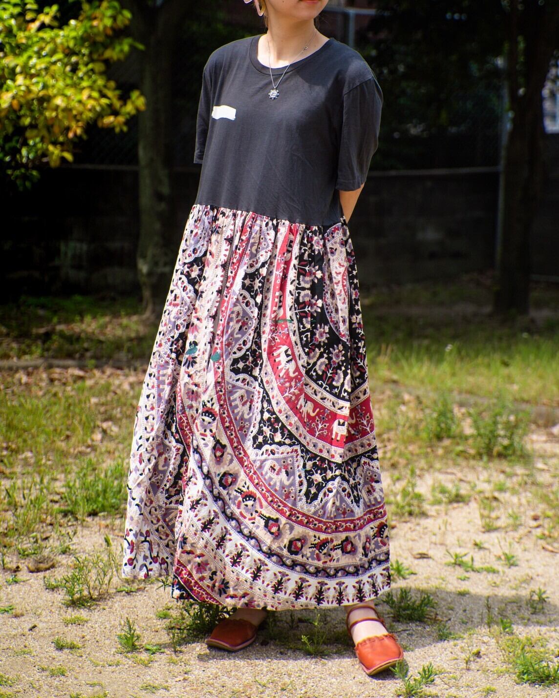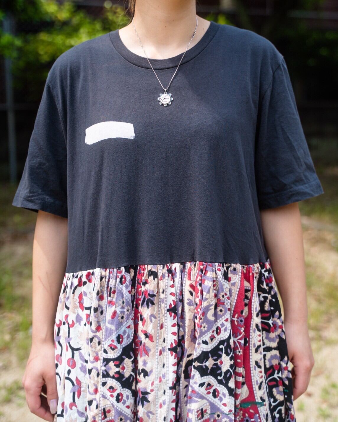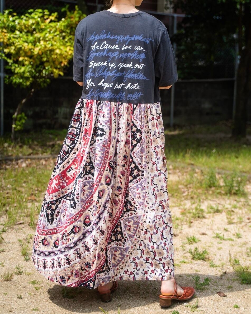 アメリカ古着のTシャツをベースに、アメリカ仕入れのファブリックを繋ぎ合わせたアイテム。
